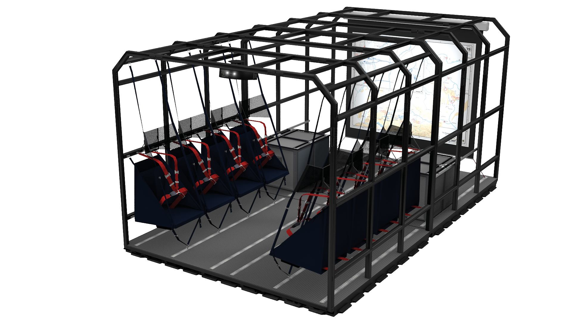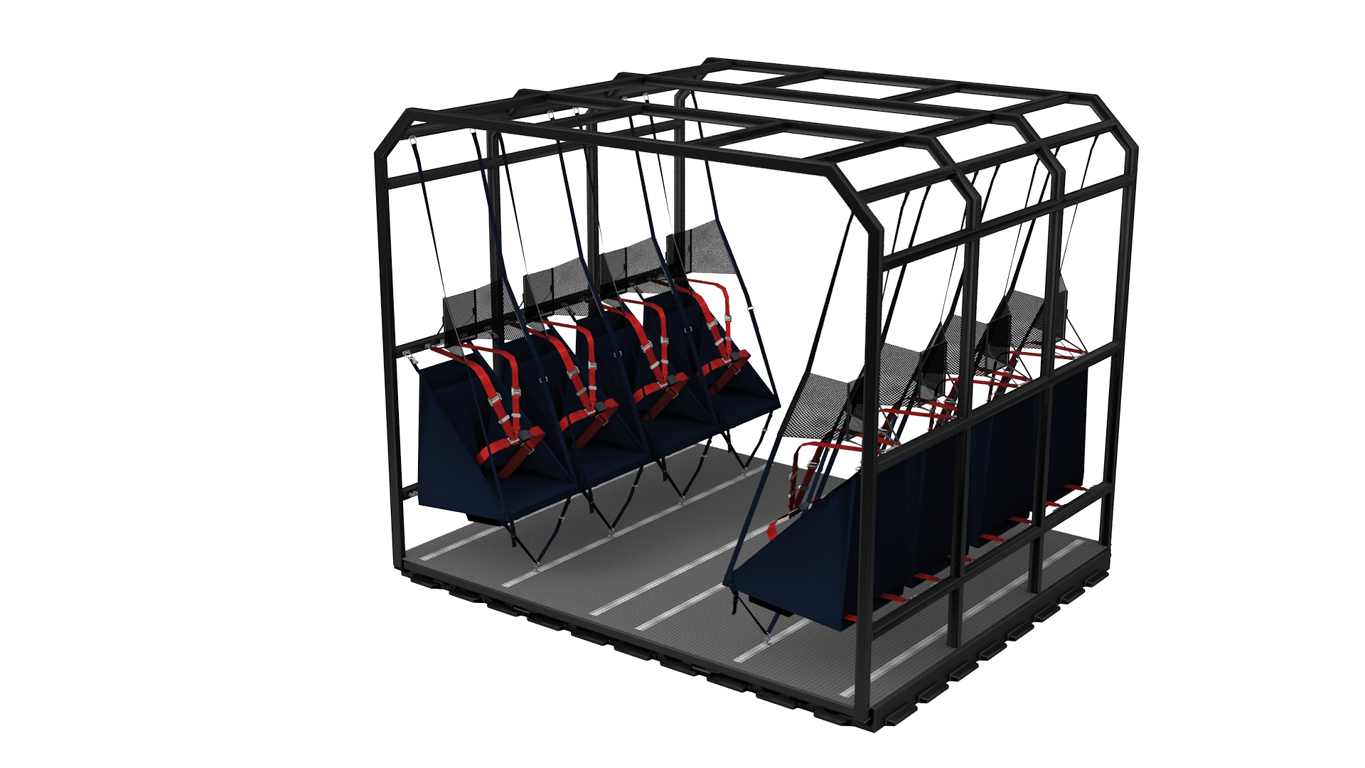 Die Sitz Paletten für den Passagier Transport sind mit Headracks für die Sauerstoffversorgung im Notfall und Sitzen der Economyklasse ausgerüstet. So ausgestattet finden zum Beispiel in der C-130 bis zu 84 Passagiere, im A400M sogar bis zu 125 Passagiere, Platz.